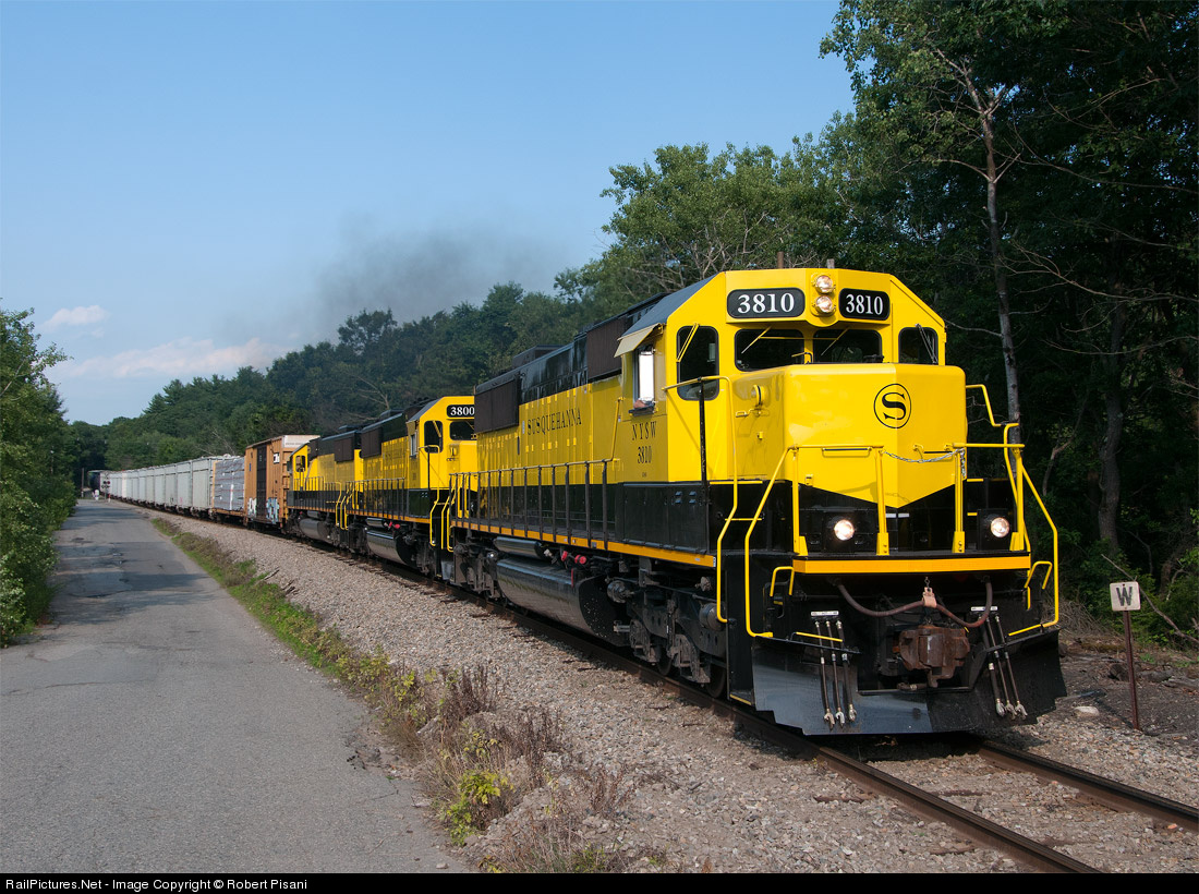A trio of new Susquehanna SD60s (3810-3800-3808) leads SU-99 westbound past the Cozy Lake Road crossing. As of the date of this photo, these were the first SD60s in service, with the remaining three units soon to follow.