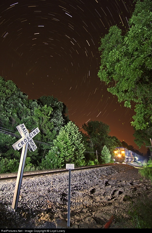The lightning bugs start to emerge from the trees, as the stars swirl above a country crossing near Clifton Forge. A stopped Westbound, damaged by storms on June 29th, continues to wait on a new engine to pull it into the yard.