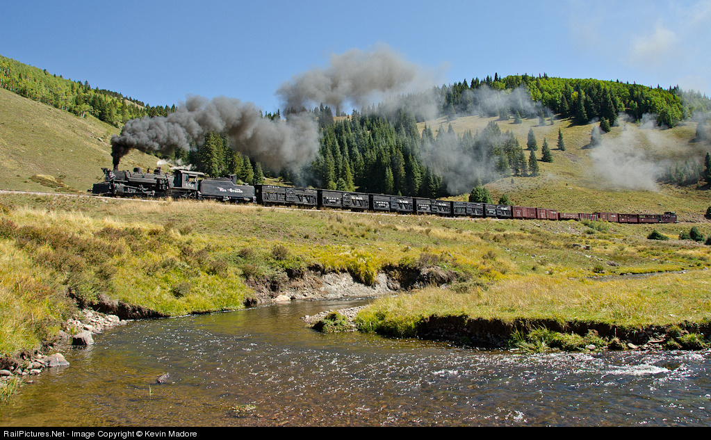 On the Rio de Los Pinos. Along the route from Osier, CO to Cumbres Pass, the old D&RGW line makes a couple of rather interesting detours that enable the railroad to gain considerable elevation, while keeping the grades manageable. The longest of these off-course meanderings is the 5-mile Los Pinos Valley stretch. Here, a westbound Rio Grande freight, destined for Cumbres Pass, has turned compass north to run along the babbling Rio de Los Pinos for about 2.5 miles. At the north end of the valley, she'll swing around a 180 degree horseshoe curve and proceed back compass south, ending up less than a half mile west of where she started this detour....but a few hundred feet higher in elevation. The famous Virginia & Truckee has been dubbed "the crookedest railroad in America", but anyone who has ridden the D&RGW line from Chama to Antonito might beg to differ.