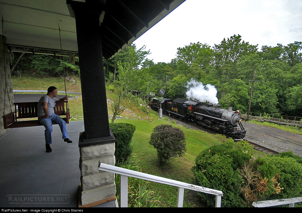 | A local resident enjoys a cool and rainy evening on his front porch swing and catches a glimpse of westbound NS deadhead move 957 as it rolls through Marion, VA with TVRM's 630 leading the way. Huge kudos should go out to the folks at TVRM/NS for making the necessary repairs to 630 to allow it to be back on the road in such short order. |