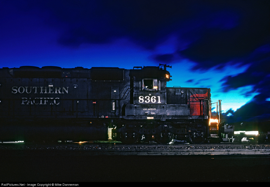 A Southern Pacific freight pauses at Mojave, California at the eastern foot of Tehachapi Pass on February 29, 1988. This winter evening, stormy clouds are still rolling off the Tehachapi Mountains in the background, framing the snoot nose of SP SD40T-2 No. 8361.
