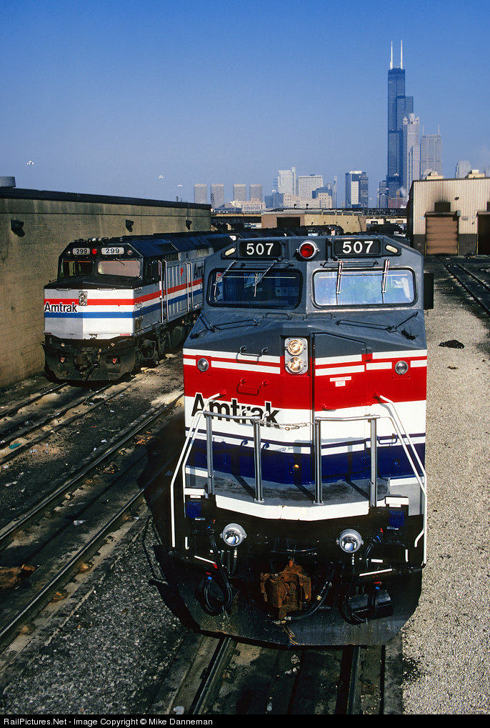 | A new Amtrak GE P32BH stands tall at Chicago, Illinois, flanked by an older EMD F40PH on a bright February 22, 1992. |