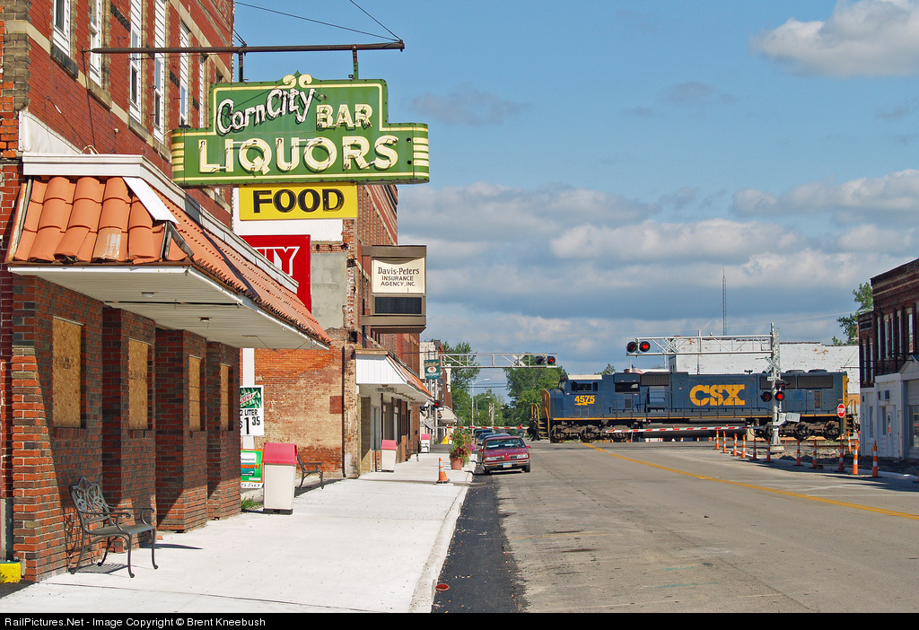 | The Corn City Bar was gutted by a fire last December, seems it is the end of the road and the bar will never reopen. The great sign still remains as a coal train passes through in the distance. |