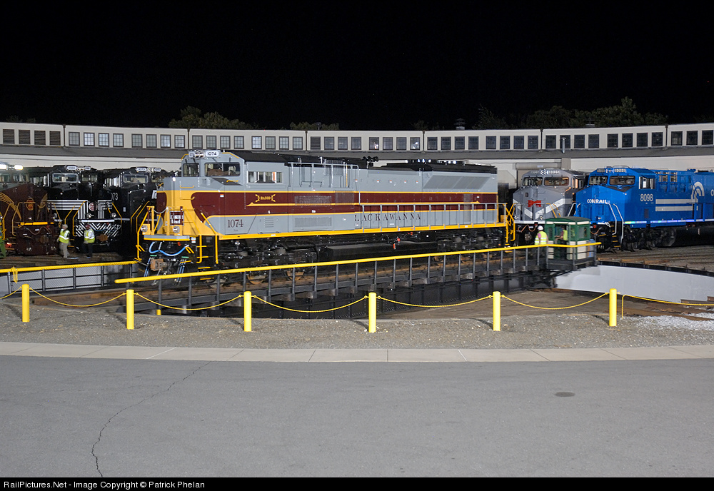 | NS 1074, the Lackawanna Railroad heritage unit, goes for a spin on the turntable at Spencer as she prepares to back into her assigned track for the NS family portrait. Thanks NS for putting this together! |
