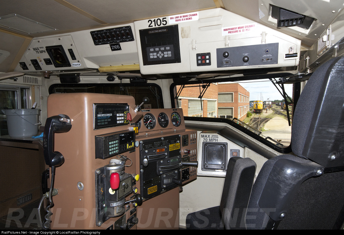 After arriving in North Bay on train 214 earlier in the afternoon, ONR 2105 was sent to the diesel shop for some maintenance and cleaning to be done. This is an interior view of the cab of 2105, in the distance a wrecked sister SD75i and 1604 can be seen in the yard. This photo was taken during a tour of the Diesel Shops with full permission, full PPE, safety glasses and hardhat were worn.
