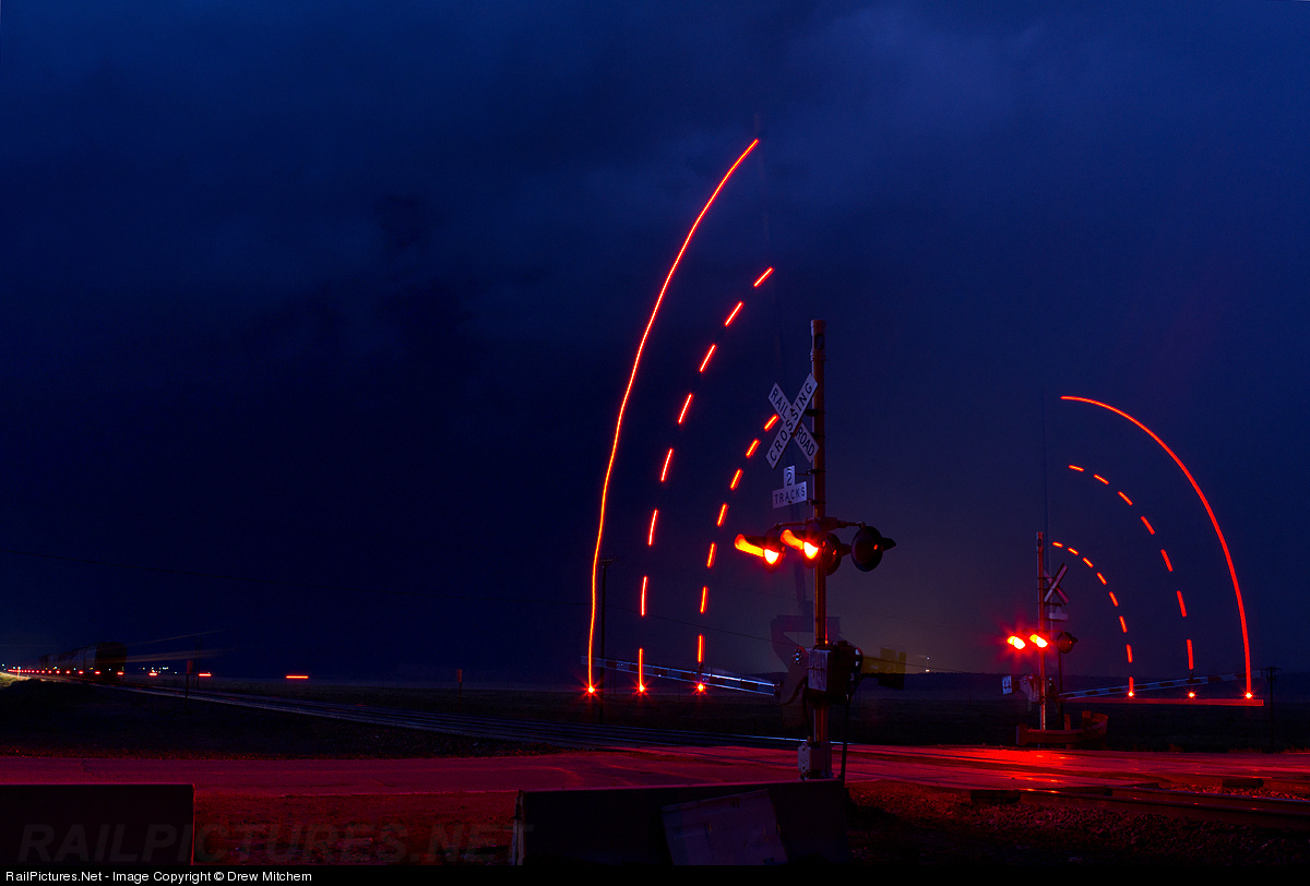 | The intention of this photo was to get the crossing gates coming up and the EOT blinking as the 211 local headed west after wyeing his train at Baca. However with a "strike of luck", a bright cloud to cloud lightning strike from behind acted as a flash and froze the train and crossing gates in motion, helping produce the results shown here. 7/11/12 |