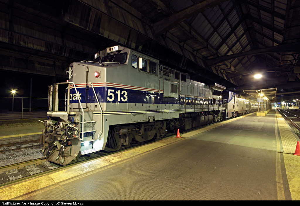 | A rare visitor but an even rarer leader to the area, 513 has just shoved back into the station after turning it's train. The trailing P42 #55 had problems in Philly and they added the Dash 8 to get it across the road. |