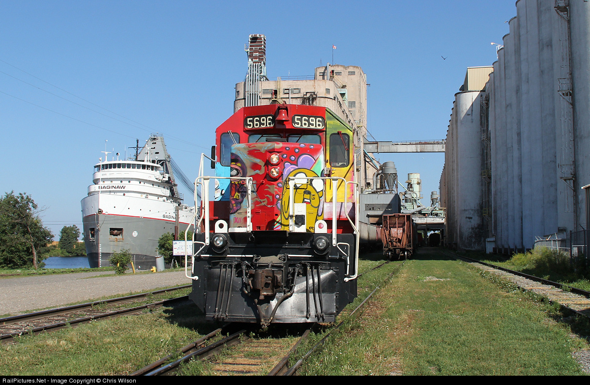 | This unit was painted up using talent, and not tagged. 5696 has a string of grain cars inhand while being unloaded. The MV Saginaw is taking on a load of grain.