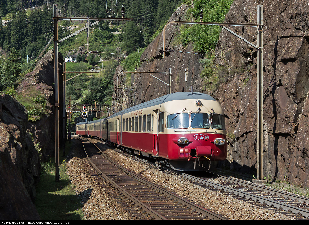 | The former Trans Europe Express RAe TEE II # 1053 made its first publicly advertised trip after the revision via the Gotthard route to Ticino and to the italian Luino on the shore of Lago Maggiore. The elegant trainset, dating from 1961, is tackling the Gotthard north ascent near Wassen. The white building above the train is a former signalman's house on the uppermost level, where the train will pass in about one minute. |