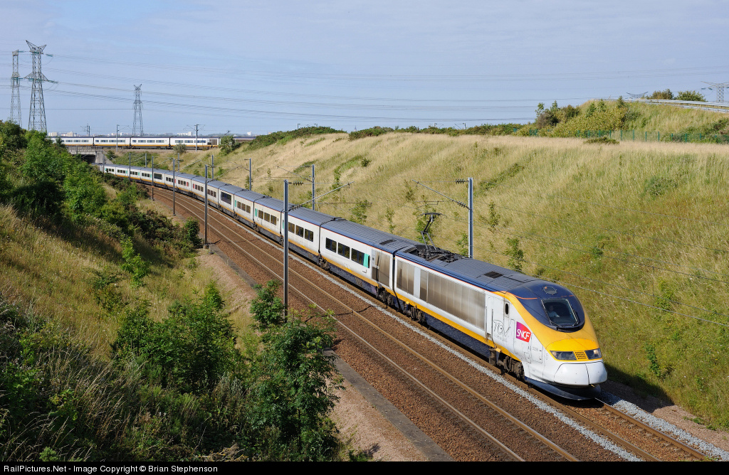 | Just 12 minutes after my previous shot the North of London Eurostar set heads away from Calais Frethun on the last leg of its journey as the 15.46 Paris Nord to Boulogne. In the background a Three Capitals Eurostar races towards the Channel Tunnel as the 16.13 Paris Nord to London St.Pancras service. |