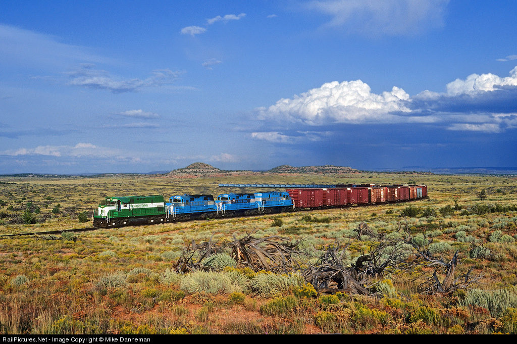 On a beautiful late summer day, the Apache Railway’s freight approaches the giant paper mill at Snowflake, Arizona. On the point is former L&N Alco C420 No. 81, which I believe was the first locomotive painted in the new green and white paint scheme, followed by three more Alcos in old blue and silver paint. Trailing are RS36s Nos. 800 and 900 delivered to Apache Railway new in 1962, followed by a former N&W C420 No. 84. The always image-conscious Apache didn’t operate very long with the two color schemes mixed together.