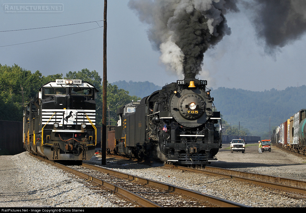 Day 2 of the deadhead move of NKP 765 from Toledo, OH to Williamson, WV is getting underway out of the yard at Portsmouth, OH and by a waiting eastbound loaded export coal train. The engine and train are enroute to Williamson for a weekend of pulling employee specials.