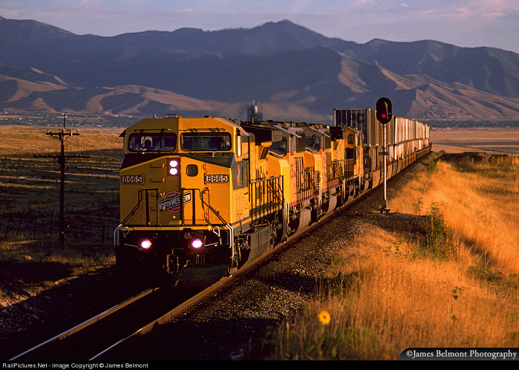 A Chicago & North Western C44-9W leads Union Pacific's LAAP (Los Angeles - American President Lines) stack train down Erda Hill just before sunset on August 19, 1995. Two CNWs are in the power consist teaming up with three UP SD60Ms. New Chicago & North Western GE power was all over the Union Pacific system soon after the 1995 merger.