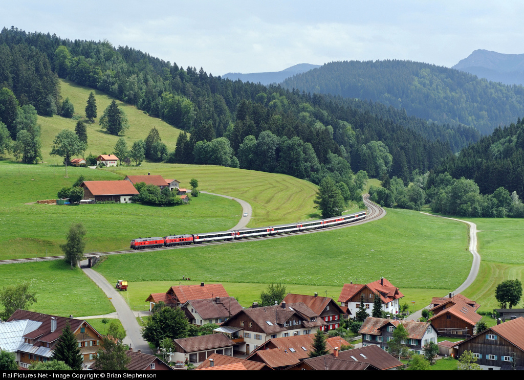 | The diverted 12.11 Munich to Lindau EuroCity train hauled by 218 422-4 and sister 218 421-6 as it makes its way through the beautifully tended Algau landscape passing the village of Oberthalhofen between Oberstaufen and Harbatshofen. This train was diverted from its usual route via Memmingen to the Kempten route due to engineering works in preparation for electrification. |