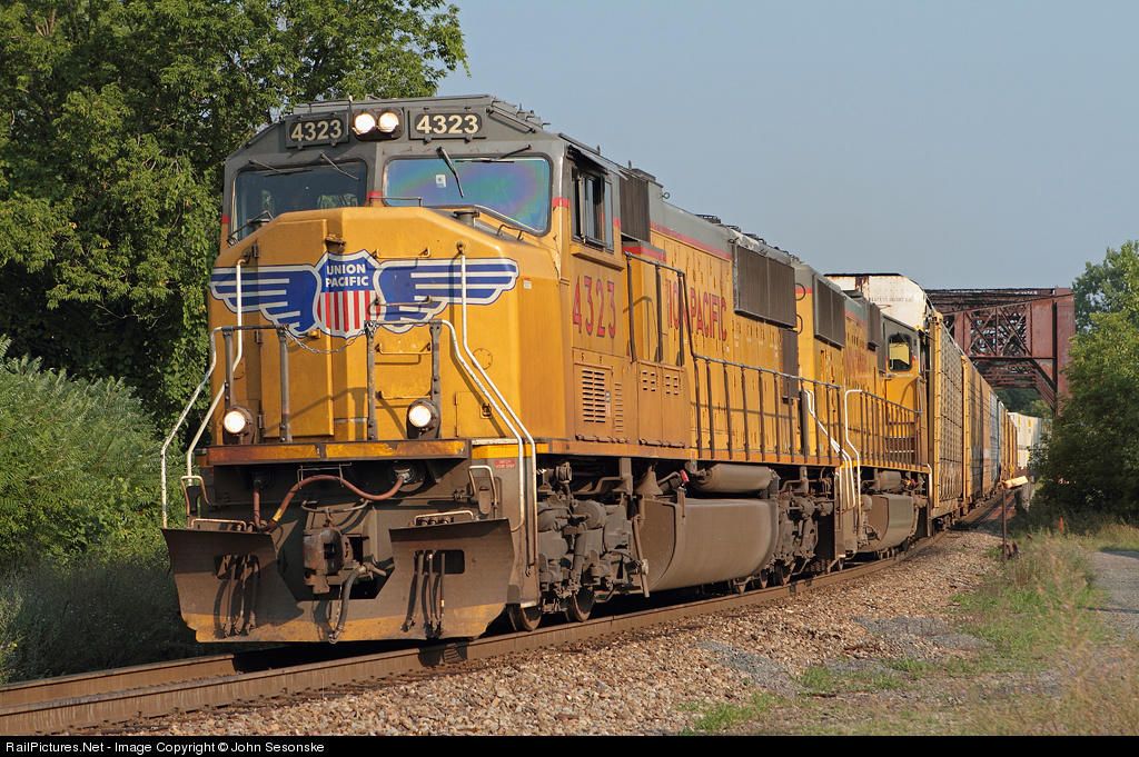 Two Union Pacific units roll auoracks and intermodals off the Mohawk River bridge at 8:40am as they approach the Maxon Road crossing on their way from Norfolk Southern's Mechanicville, NY intermodal site to Chicago. Of note is the fact that autoracks are now moving in and out of Mechanicville on this train as of this week. Previously they were being dropped in Delanson for unloading in Guilderland.