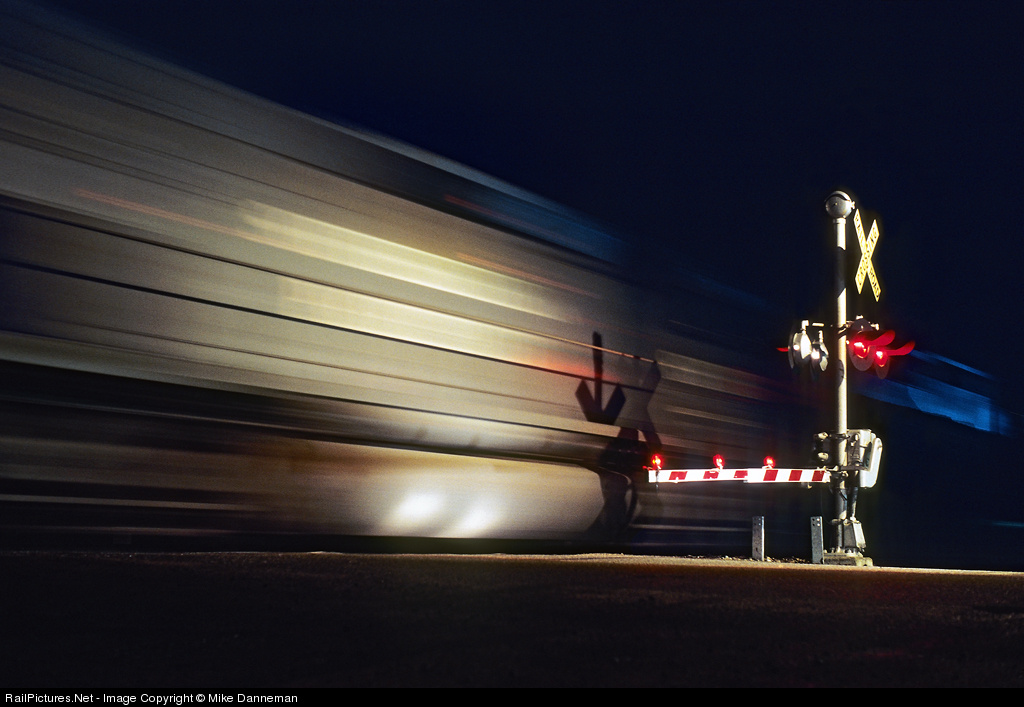 A Southern Pacific freight led by the ever-present Tunnel Motors, crosses Oak Creek Road grade crossing at Mojave, California, on the night of February, 28, 1988.