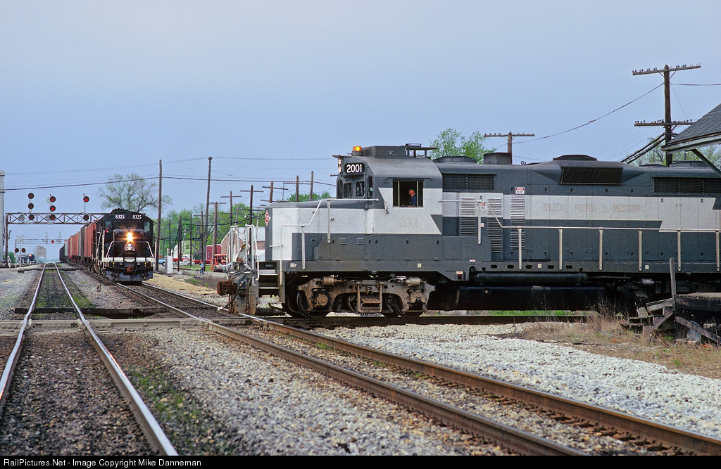 With an Illinois Central southbound freight waiting, a Toledo, Peoria and Western westbound crosses the diamonds at Gilman, Illinois, on May 5, 1990. The TP&W in this era was repainting some of its former Santa Fe GP20s in this New York Central-inspired paint scheme.