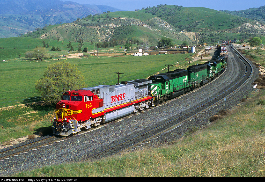 | Clean warbonnet BNSF Dash-9 No. 766 leads four former BN SD40-2s on a westbound freight passing through Bealville, California, on March 28, 2001. |