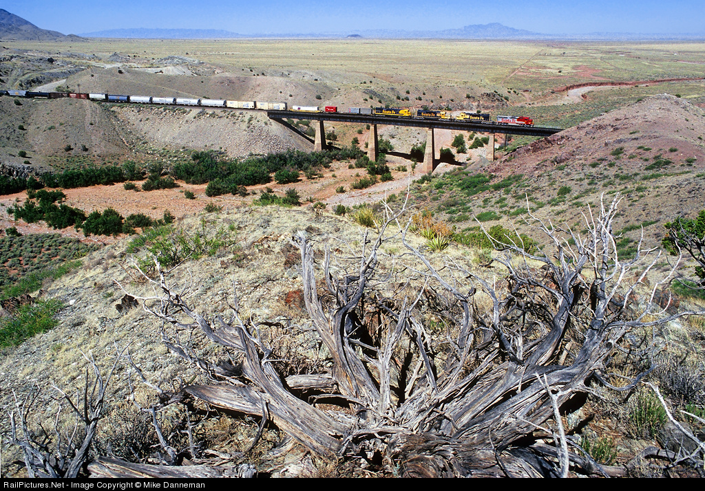 A westbound Santa Fe freight crosses Abo Arroyo on Bridge 874.2 as the train departs Abo Canyon and heads for a crew change at Belen, New Mexico, on May 23, 1991. On the point is a Superfleet GP60M and trailing are two SD40-2s and a GE Dash 8-40B.