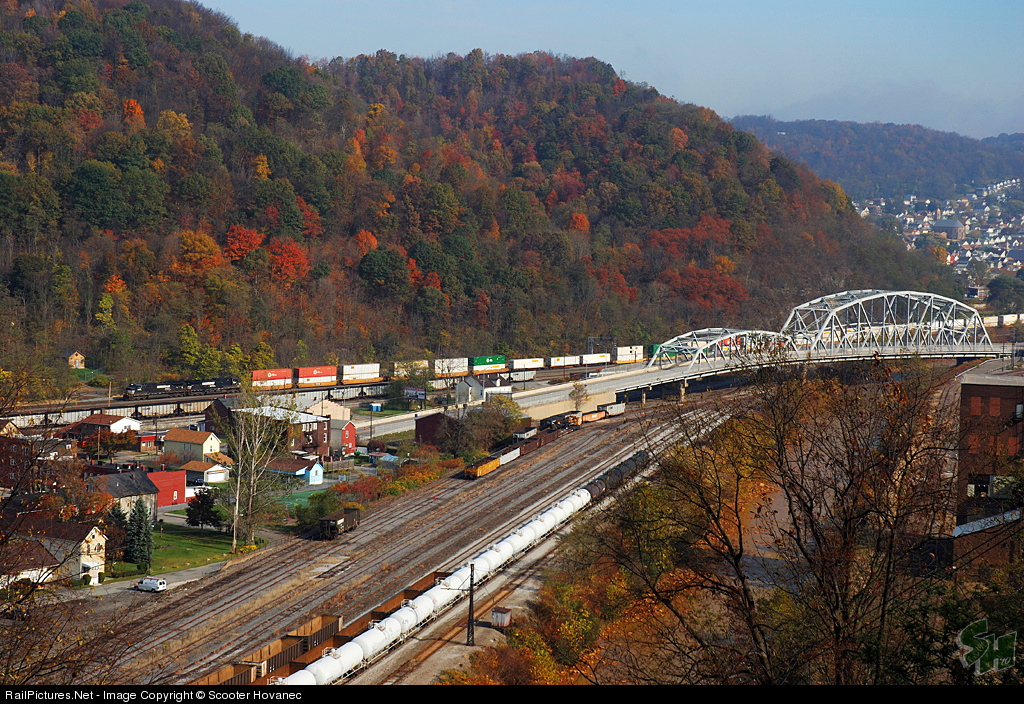 A stacker rolls west behind a pair of GE's on a fall morning on the north east side of Johnstown. In the foreground is the joint NS - Conemaugh and Black Lick Cambria Yard, which was host to a string of stored tank cars on this morning. This was once a major interchange point for traffic in and out of the mills of Johnstown. At the bottom right is a portion of the former Bethlehem Steel car shops. Responsible for building thousands of hoppers, flatcars and gondolas over the years, the car shops and most of the mills in this area are gone. Still intact though is NS's Woodvale Yard where a cut of hoppers sit, East Conemaugh Boro, tucked into the mountains at top right, and finally the Maple Ave. bridge at center. Completed in 1959, the bridge was built with tracks for streetcars of the Johnstown Traction Co. which saw service just over a year before streetcar service ended in June of 1960.