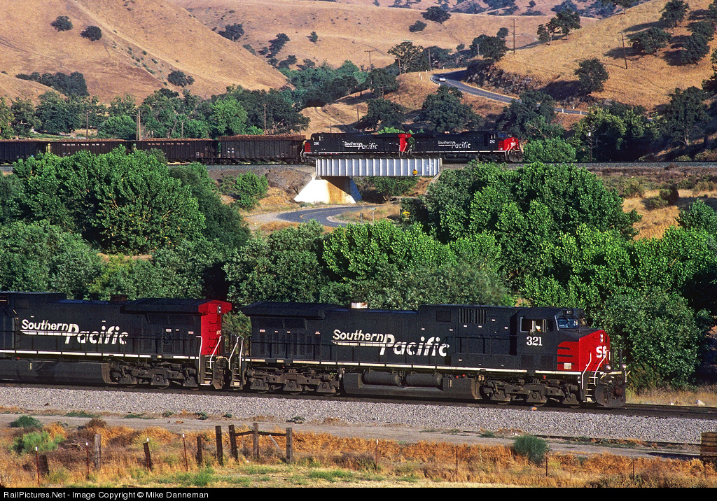 On the afternoon of June 29, 1996, a westbound Southern Pacific unit sugar beet train circles the horseshoe curve at Caliente, California, on the busy Tehachapi Pass route. Four new SP AC4400CWs power the train, with Nos. 321 and 107 on the point and Nos. 266 and 282 operating in DPU mode on the rear.