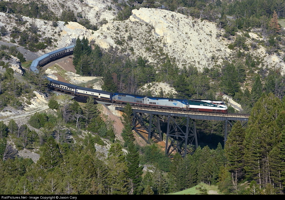 Amtrak 490 leads the Montana Daylight over Austin Creek Viaduct. I believe this one of the last trains the tour company ran over the MRL...