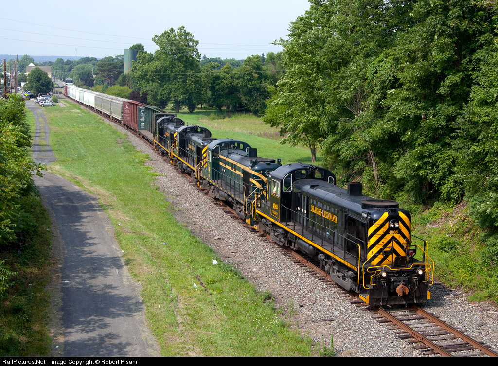 The other heritage fleet... The D-L has amassed quite a heritage fleet of its own. I suspect there is nowhere else in the world where you can see four ALCO RS3s hauling revenue freight on a well-maintained main line. Here 4068, 1554 (CNJ), 4118 and 4103 head east for the NS interchange at Slateford Junction. After a cloudy and sometimes rainy chase from Scranton, the sun finally made an appearance in East Stroudsburg. A tip of the hat to the fine folks at the D-L who keep these wonderful machines running!