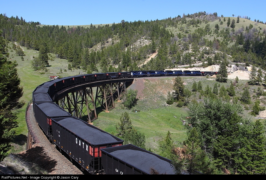 Helpers for BNSF 5369. Export Coke out of the refineries in Billings is often run in unit trains to west coast ports. Here one of those export trains crosses Greenhorn Creek.