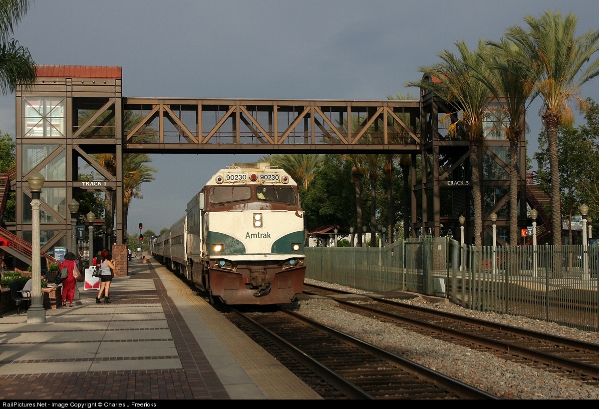 | An hour late Pacific Surfliner #583 arrives behind NCPU #90230 in Cascade colors. As this train arrived about the time the next train, which goes further north of LA, was supposed to arrive, there ended up being a huge amount of confusion with people boarding and then getting back off. |