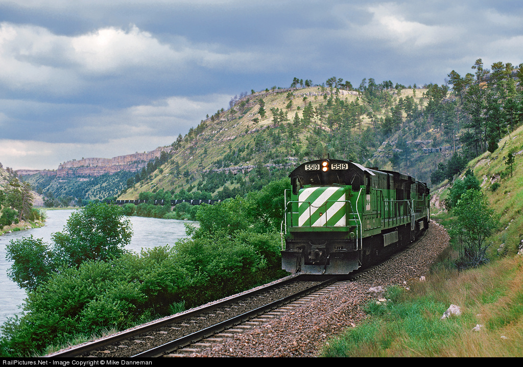 A Burlington Northern Santa Fe empty coal train, still looking a lot like the Burlington Northern, curves along the North Platte River through scenic Wendover Canyon, Wyoming, on July 6, 1996. The lead BN GE C30-7 looks a bit different, with the blanked headlight receptacle missing from the nose.