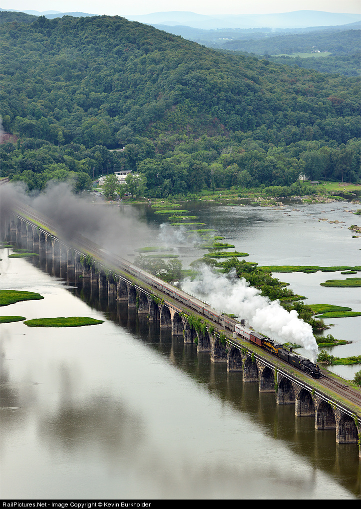 | The Norfolk Southern steam program finished up its weekend crossing of the Susquehanna River over the Rockville Bridge. On the first trip of the day, the train is seen putting up a full head of steam as it accelerates across the famous stone arch bridge with the NKP 2-8-4 765 doing the honors. |