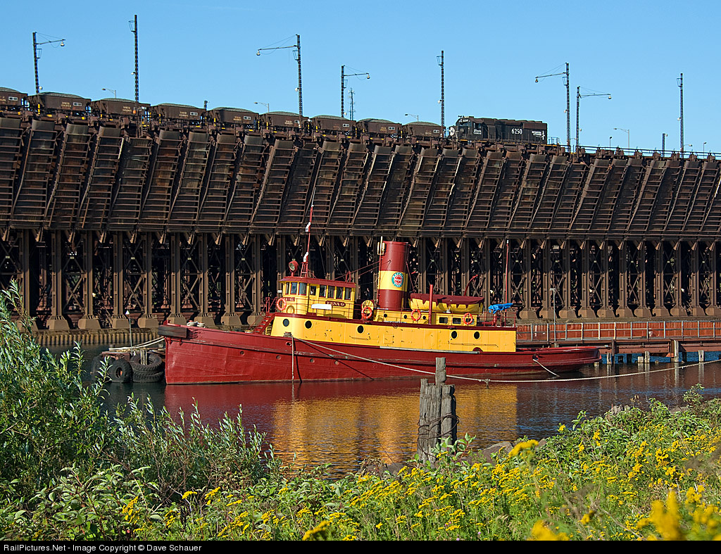 IC 6250 positions ore cars on the top of Dock #1 as the retired DM&IR steam tug Edna G waits for the day's tourists to arrive.