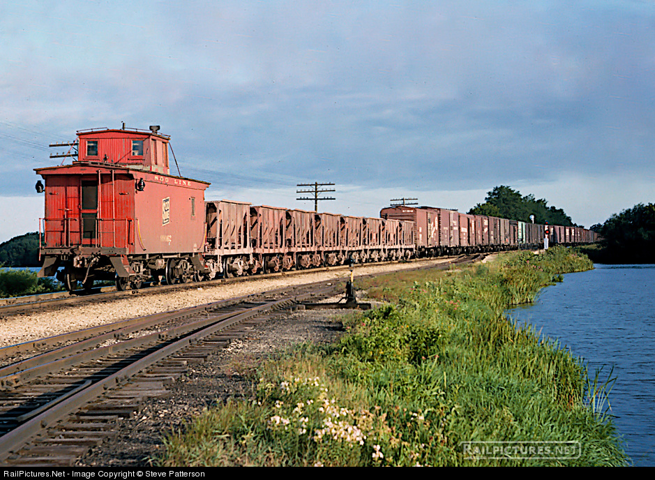 Passing a lake at Burlington, Wisconsin, Soo Line wooden caboose 99062 bobbles on the rear of a freight with empty ore jennies and numerous 40-ft. box cars early in the morning on Aug. 13, 1964. The train originated at Schiller Park in Chicago and has 83 miles to go to Fond du Lac.