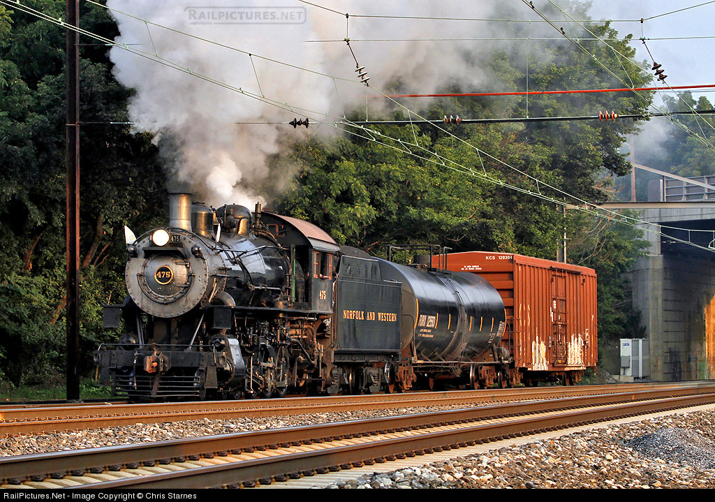 | Early on an August morning Strasburg's former N&W M-class #475 heads back for the transloading yard at Strasburg with two loads from the NS interchange just out of view to the right. In the foreground is the double track high speed Keystone Corridor between Philadelphia and Harrisburg, PA. |