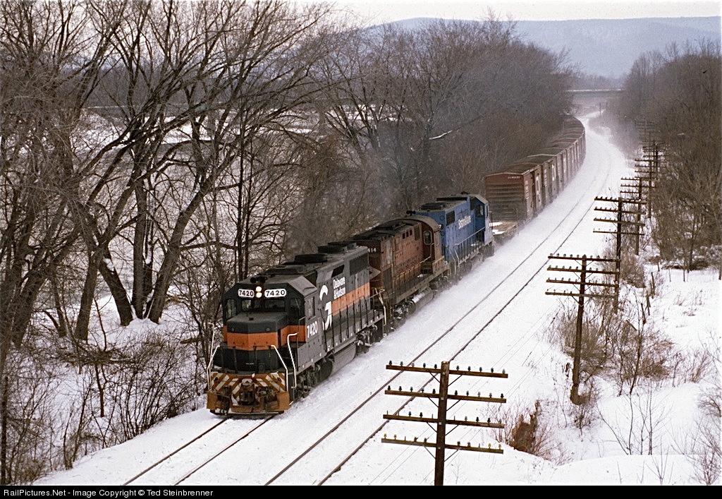 A typical Guilford-era consist on the D&H leads a northbound as it approaches the former Lackawanna East Binghamton yard. The second unit, C420 #414, now on the Delaware Lackawanna, has remarkably worn Lehigh Valley paint for it's entire career, having been painted back into the yellow jacket scheme after leaving the D&H.