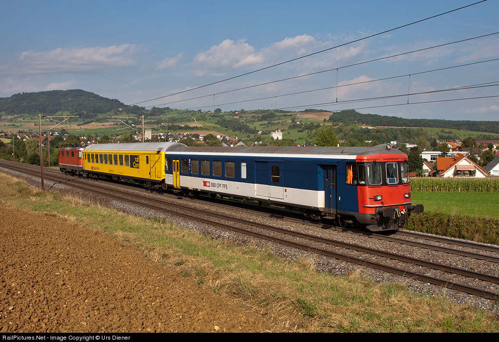 | Radio test train with an EW I BDt cabcar, the raidio test coach X 60 85 99-73 109-8 and the pushing Re 4/4 II 11154 on the Bözberg norht ramp. The test coach is equipped with measurement receivers, mobile telecommunications testing devices, measurement antennae and computers. It also houses systems for measuring PMR and GSM(-R) applications. |