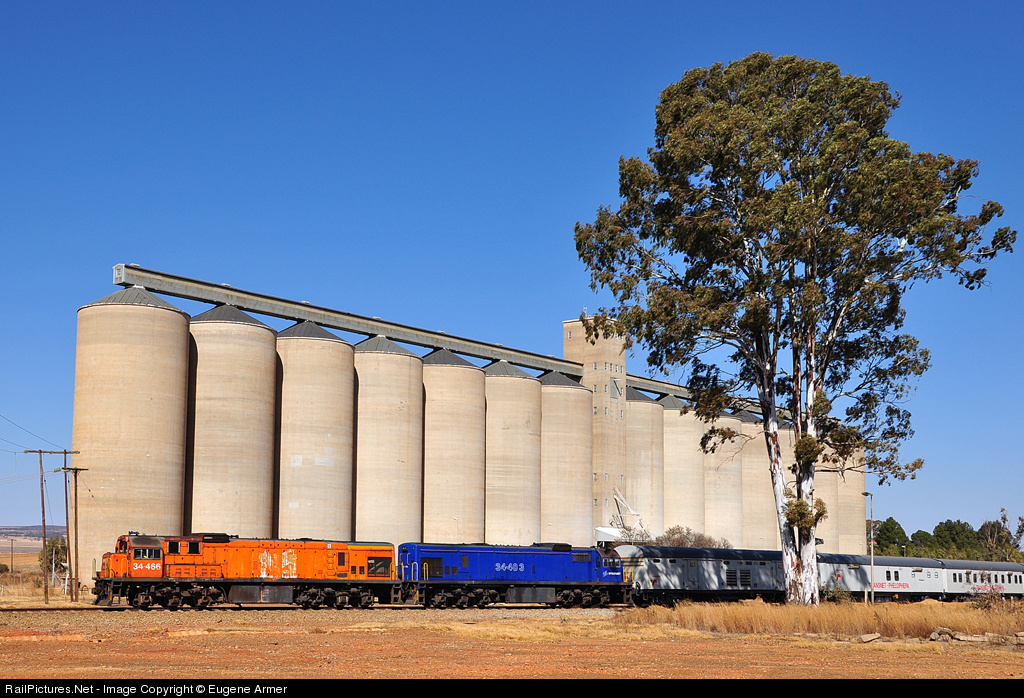 | A lone bluegum tree and 14 grain silos combine to frame this pair of class 34-400 GE U26C's as they depart from Boons after a crossing with a westbound freight, hauling the Phelophepa 2 health care train east to Johannesburg. The train is on a repositioning move from Mafikeng to Heystekrand, near the resort of Sun City. |