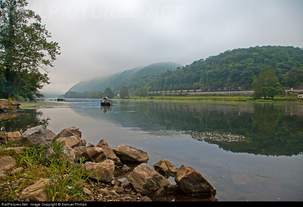 | As early morning fog lies along the New River near Narrows, VA, NS Q7A rumbles west as it fills the valley with the sound of a train roaring west toward Bluefield. |