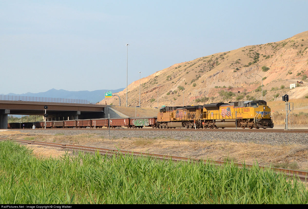 Union Pacific train OVWWO 12 (Ore, Vancouver WA to Wendover UT) passes under Interstate 15 as it approaches North Yard in Salt Lake City, Utah. This train, comprised of all CHTT gondolas of mixed heritage (UP, MP, RGON and Golden West Service), is empty even though all the cars have tarps on them. UP SD70ACe 8628 (a May 2008 graduate of EMD's London ON plant) and AC4400CW 5998 (which rolled out of GE's Erie PA plant in October 2003) have the job of moving this train on August 13, 2012.