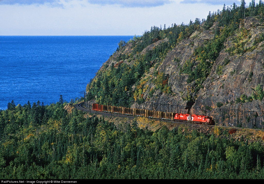 A Canadian Pacific local is eastbound along Lake Superior approaching Middleton, Ontario, on September 24, 1993. A pair of GP38-2s power the short train.