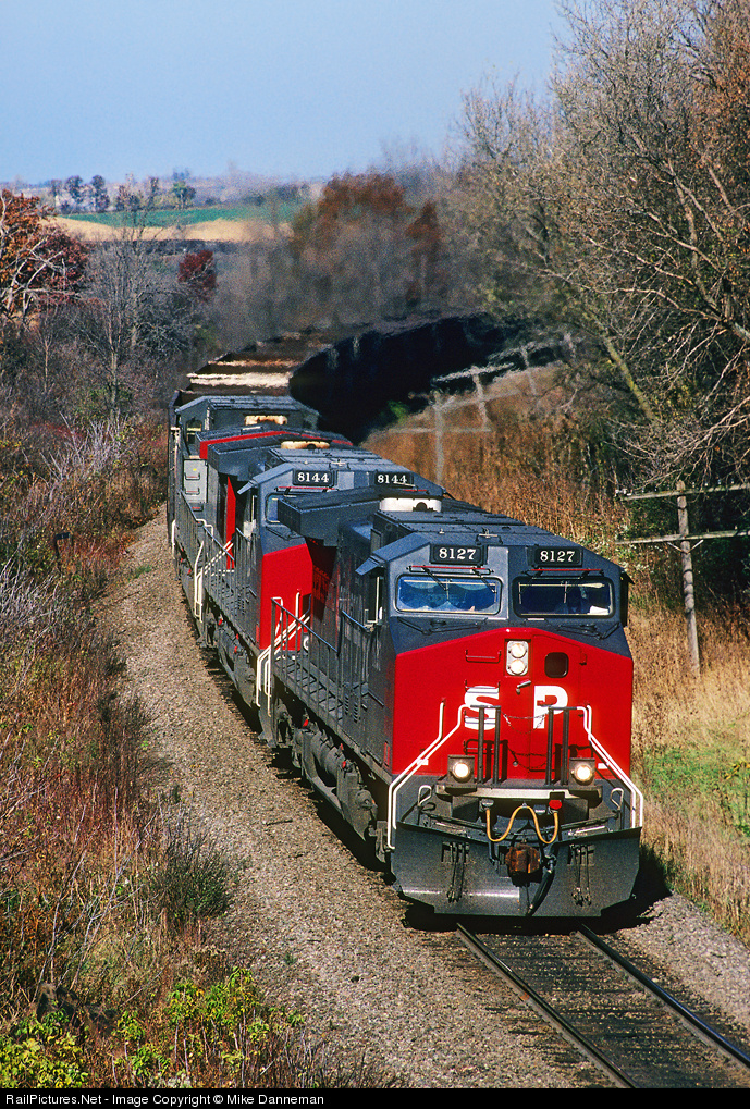 Three new Southern Pacific GE Dash 9-44CWs climb Byron Hill with a taconite ore train on a bright autumn day in Wisconsin on October 27, 1994. For a brief time in this era, Wisconsin Central and SP jointly operated these ore trains from Minnesota’s Iron Range to Geneva Steel in Utah.