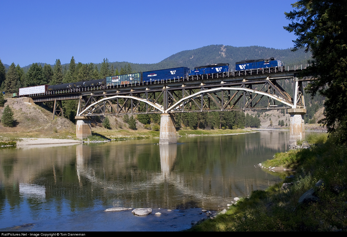 Montana Rail Link’s Paradise Local rolls across the Clark Fork River near Donlan, Montana. The local, with a pair of GP9s, is heading back to Paradise, and on to Thompson River Lumber near Thompson Falls.