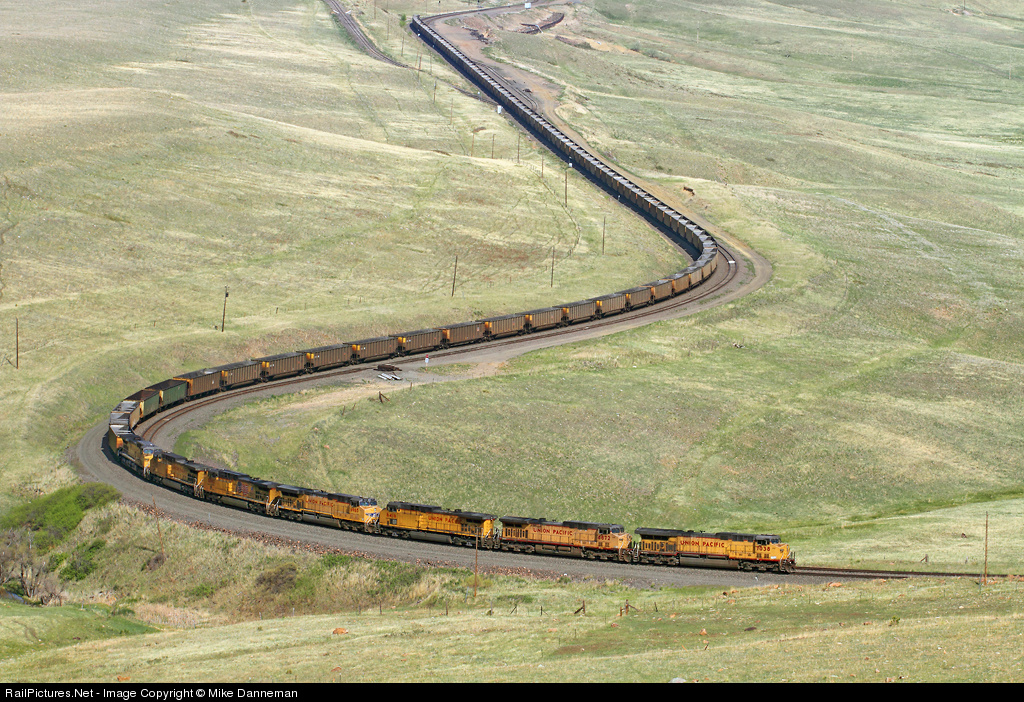 A westbound Union Pacific coal train snakes through Little 10 Curve at Rocky, Colorado, on May 29, 2011. Little 10 Curve is less photographed and is not as dynamic than Big 10, but both are a demanding 10 degrees of curvature nonetheless. Seven AC4400CWs on the point hustle the empty train west, and several of the locomotives will be set up mid-train and on the rear as DPUs once the train is loaded.