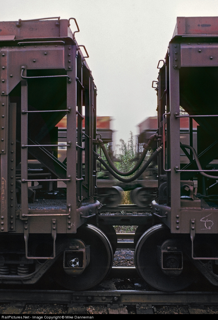 Ore connections A closeup of the drawbar and air line arrangement of a Duluth, Missabe and Iron Range “quad” ore car. These were a set of four ore cars permanently coupled together using drawbars, with couplers only at the ends of the quad set. A T-Bird shuttle train rumbles by in the background in this September 23, 1994, view at Fairlane, Minnesota.