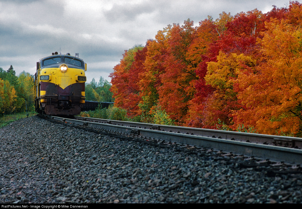 LTV Steel (former Erie Mining Company) F9's move ore toward Taconite Harbor on dreary, yet colorful autumn day of September 23, 1993. This view is a few miles west of Taconite Harbor near the Cramer Road grade crossing.