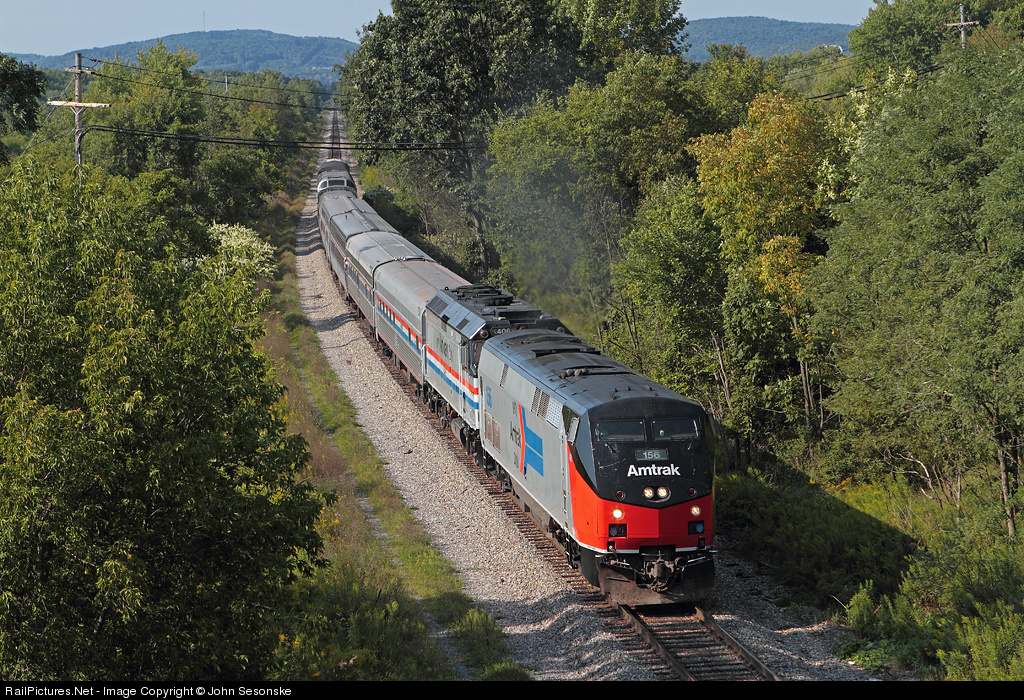 On the tracks of Phoebe Snow. The special equipment move for display at Steamtown's Railfest, lead by the Phase I heritage and AMTK 406, is about to duck under the NY Rt 7 overpass as it accelerates down the CP main. The train is just south of CP's East Binghamton yard on the final leg of its CSX-NYSW-CP trip out of Albany-Rensselaer via Syracuse. Train consists of 5 Amtrak cars and 4 private cars with revenue passengers. This is the ex DL&W and EL mainline where the Phoebe Snow once ran. Consist is as follows: AMTK 156, NPCU (ex F40) AMTK 406, Heritage Sleeper AMTK 10020 "Pacific Bend", Heritage Sleeper-Crew Dorm AMTK 10021 "Pacific Cape", Viewliner Sleeper AMTK 62025, Viewliner Diner prototype AMTK 8400 "Indianapolis", Amfleet Cafe AMTK 48140, Iowa Pacific Full Dome SLRG 551 "Sky View", ex UP sleeper RPCX 2263 "Berlin" in AOE colors, Business Car New York Central 3 "Portland", Business Car Milwaukee Road "Wisconsin".