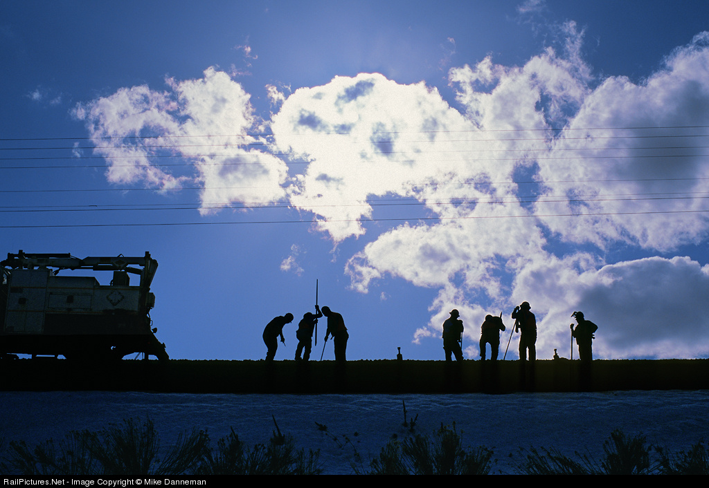 On the afternoon of March 17, 2009, the Helper section gang does some track work near the East Summit switch at Soldier Summit, Utah. Track jacks, tamping bars, and some muscle and sweat, will get this piece of railroad back up where it should be again.