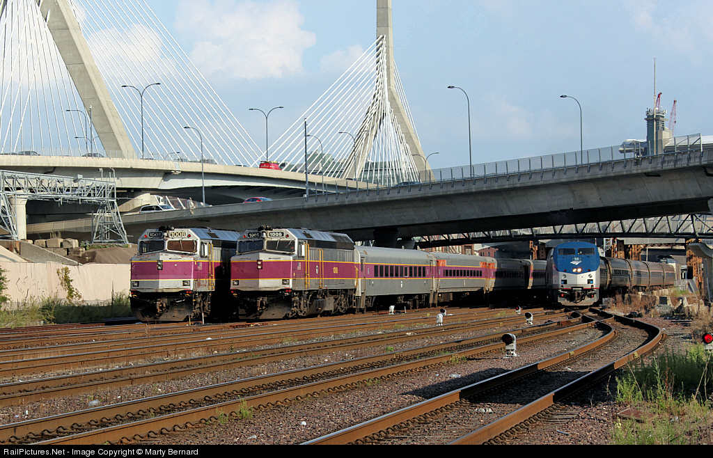 | That's the 5:00 pm Portland bound Downeaster in the distance and the towers of the of the new Leonard P. Zakim Bunker Hill Memorial Bridge (Interstate 93) spanning the Charles River. The bridge was part of the Big Dig. |