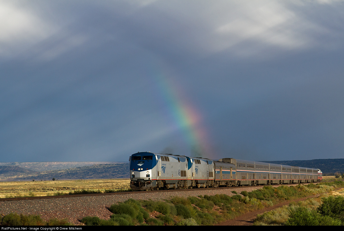 Amtrak #3 races west out of a late monsoon season thunderstorm 9/12/12. A partial rainbow and rays of sun stand out from the dark sky in the background.