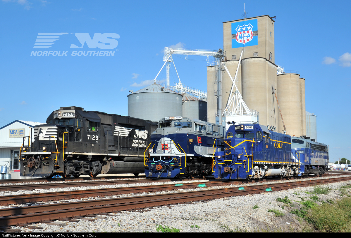 2012 marks the 30th anniversary for Norfolk Southern, as well as the 25th anniversary for the Columbia Terminal Railroad. NS Illinois Division local train number D29 with 7129 poses with the NS Wabash heritage unit and the COLT's GP7, along with the Columbia Star Dinner Train's F7. These are all operating in former Wabash territory. Photo by Casey Thomason. For more information, visit www.nscorp.com and http://www.gocolumbiamo.com/WaterandLight/About_Us/COLT/ and http://www.dinnertrain.com/